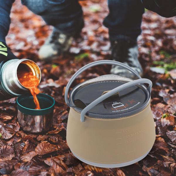 安全な食品グレードのシリコーン素材でできており.臭いがなく.表面がべたつかず.お手入れがとても簡単です.水.お茶.コーヒーを入れたり加熱したりするだけでなく.料理にも使用できます.耐熱ステンレスベースは.キャンプ用コンロやコンロに直接置くことができます.電気ストーブ.キャンプ用ガスタンク.キッチン用ガスストーブなどにご使用ください.折りたたみ可能なコンパクトなデザインで.持ち運びが簡単で.キャンプ.ハイキング.トラベルパックの荷物のスペースを節約できます.