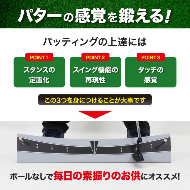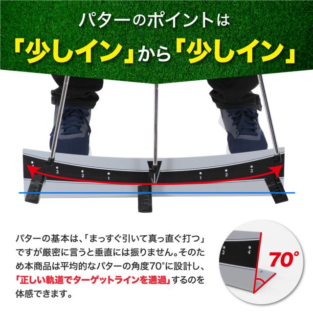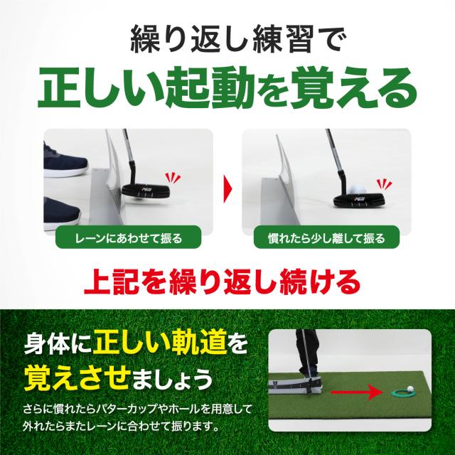 【正しいパッティングフォームを身に着ける】パターのヒール部分をレールに沿わせて打つだけで、正しいストロークはもちろん、正しいパッティングフォームが身に付き継続的なパター練習ができます。