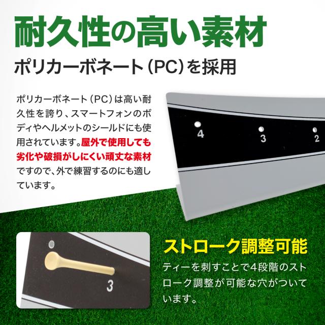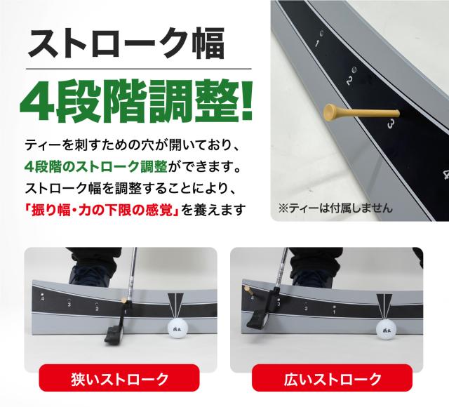 【ティー穴付きでストローク幅の調整が可能】ティー穴が付いているので、ティーを差し込めば4段階のストローク幅で練習が可能です。ティーは付属しておりませんので、ご利用の際はご用意をお願いいたします。
