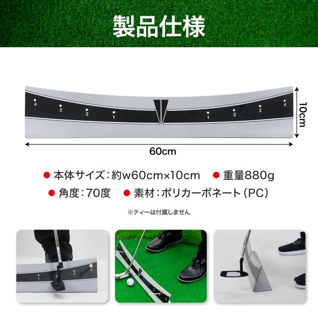 パターのヒール部分をレールに沿って打つだけで、正しいストローク・パッティングフォームが身に付きます。ティーが刺せる穴付きで、ティーを差し込めば4段階の振り幅練習が可能!