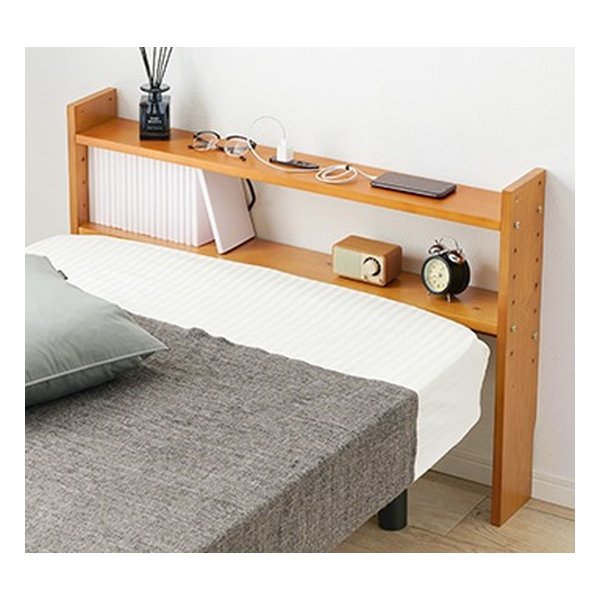 ベッドの枕側やサイドに置ける薄型収納棚板の高さが変えられ、コンセント付きなので便利