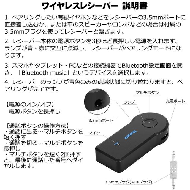 | ワイヤレスレシーバー Bluetooth4.1対応 ハンズフリー通話可能 マイク搭載 約4時間再生可能 車載AUX対応 充電式 Bluetoothレシーバー 有線イヤホンを無線化 AUXプラグ付 子機 WEB日本語説明書付 |