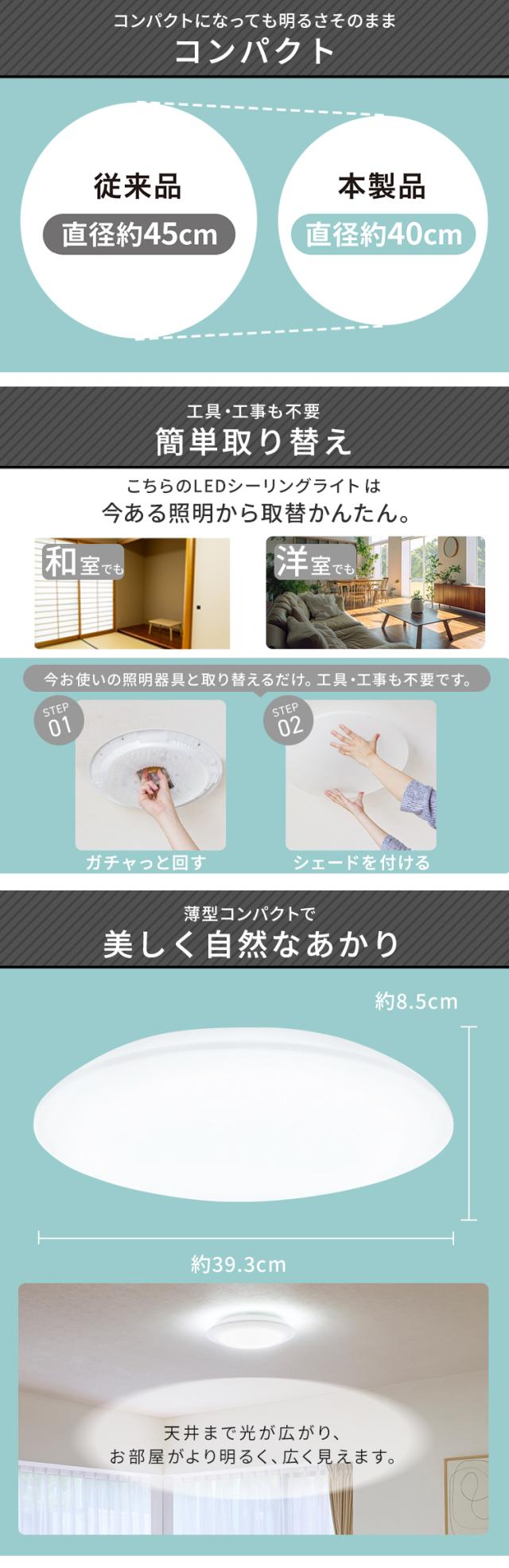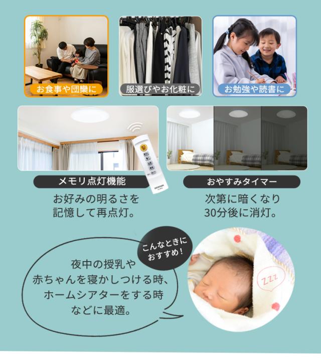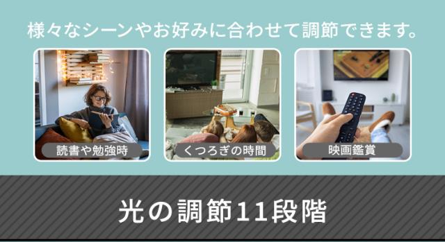 常夜灯、おやすみタイマー(30分)、調光/調色(10段階/11段階)、壁スイッチ切換対応、ラストメモリー