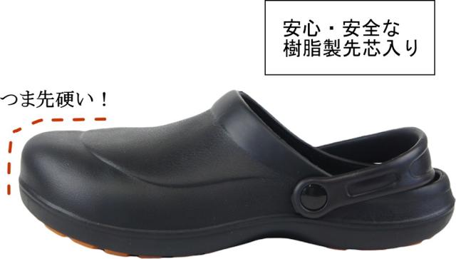 樹脂製のトゥキャップが入った安全靴タイプのクロッグサンダル