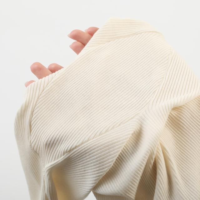 ゴムは使用していませんが、ふわふわと柔らかく伸縮するリブニットによって自然に足のラインに沿い、お腹までしっかり包み込む安心感のある設計です。 鼠径部は、添えるだけ。