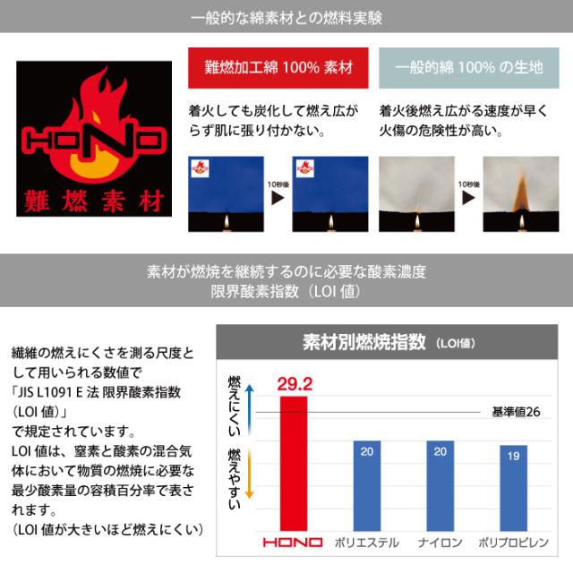 ◇HONOブランドの難燃(防炎)シャツは耐炎・耐熱・静電性に優れたやわらかく肌触りのよい難燃(防炎)素材を採用