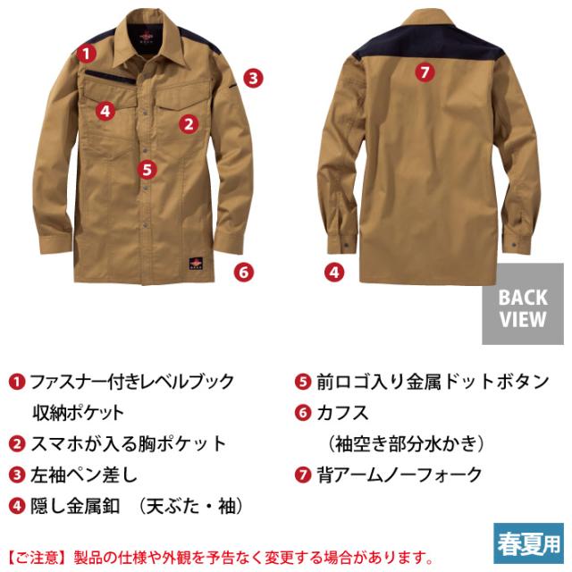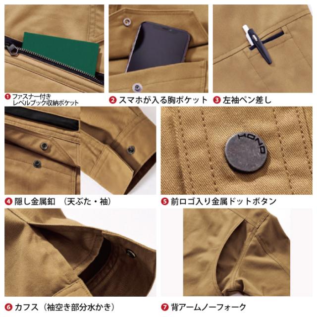 ◇機能:ファスナー付きレベルブック収納ポケット・スマホが入る胸ポケット・左袖ペン差し・隠し金属釦(アマブタ・袖)・前ロゴ入り金属ドット釦・背アームノーフォーク・カフス(袖空き部分水かき)