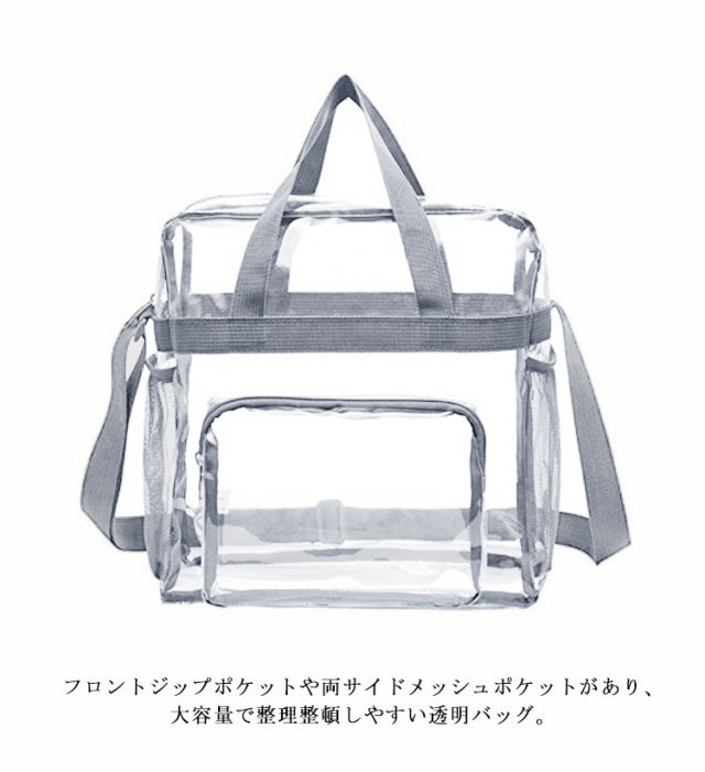 | ライブやスポーツ観戦、海外イベントに欠かせないファスナー付きクリアバッグ。 フロントジップポケットや両サイドメッシュポケットがあり、大容量で整理整頓しやすい透明バッグ。 耐久性のあるPVC素材で作られており、防水性と耐摩耗性があり、プールやジムで濡れた衣類やタオル、靴、レジャー用品などを収納しても安心して持ち運びOK! 透明なデザインで、中身が一目瞭然、Aサイズも入る大容量で日帰り旅行、着替え、化粧ポーチ、折り畳み傘などを収納可能です。 肩がけでも手持ちでも使える2-way仕様はシーンに合わせてお使いいただけます。 メンズもレディースも使えるシンプルなデザイン、レジャー、プール、海、スポーツ、スパ、温泉などあらゆるシーンで便利に使えるビニールバッグです。 | |