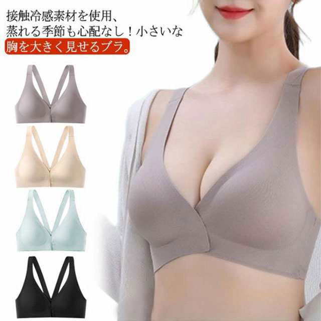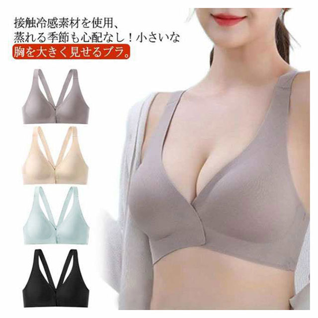 | 接触冷感素材を使用、蒸れる季節も心配なし!小さいな胸を大きく見せるブラ。 取り外し可能のカップで、洗いやすいも嬉しいポイント。 フロントホックで谷間メイク×ノンワイヤーで窮屈感を軽減。 しっかり胸をつつんで綺麗なシルエットを作ります。 ストラップも太目仕様なので、肩への食い込みも軽減されます。 X字型バックストラップで背中をフラットに抑え、スッキリとした後ろ姿に。 | |
