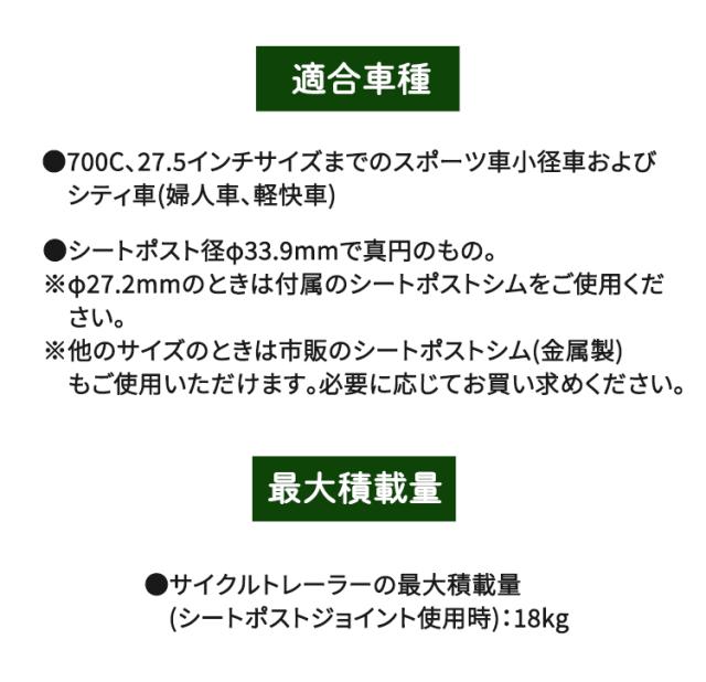 サイクルトレーラーの最大積載量(シートポストジョイント使用時):18kg |