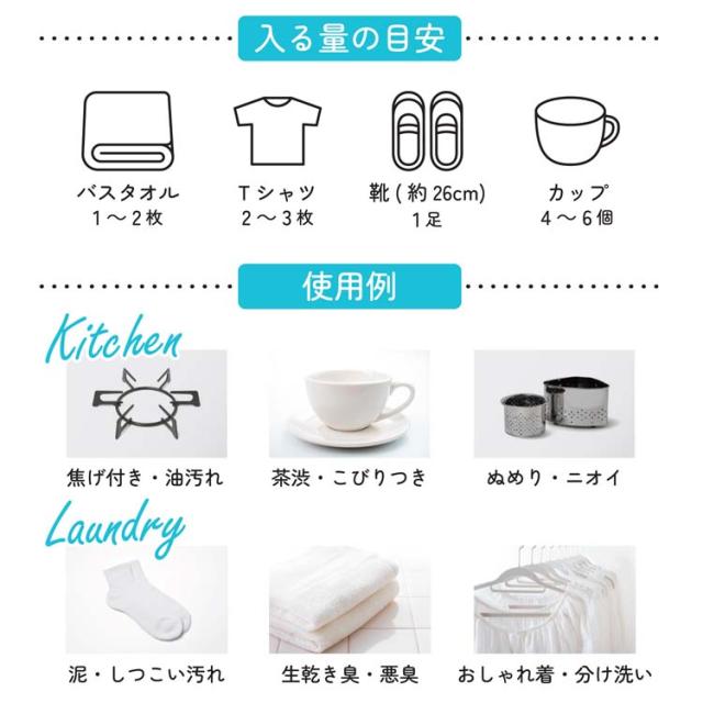 ●ランドリーまわり:靴や靴下などの泥汚れ、しつこい汚れ、タオルなどの生乾き臭、悪臭、おしゃれ着の分け洗いに。
