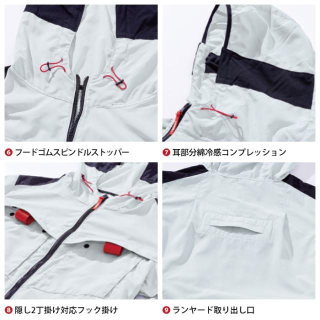 ◇機能:フロントファスナー・フードストレッチパイピン・両胸マチ入りポケット・アームホールニットパイピンゴム・フードゴム・ファスナー付きバッテリーポケット・ケーブル止めマジックテープ・首回り風抜け仕様