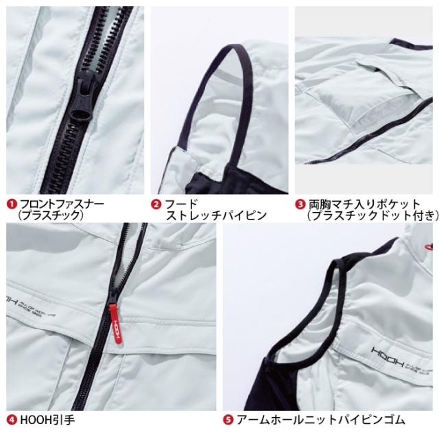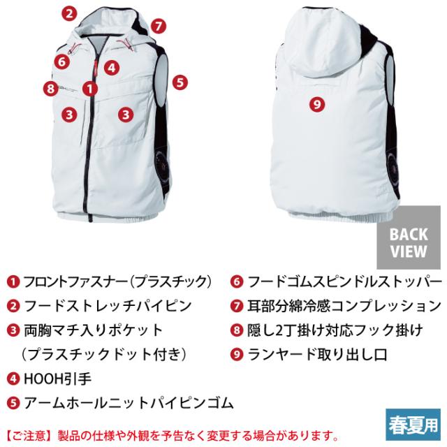 ◇機能:フロントファスナー・フードストレッチパイピン・両胸マチ入りポケット・アームホールニットパイピンゴム・フードゴム・ファスナー付きバッテリーポケット・ケーブル止めマジックテープ・首回り風抜け仕様