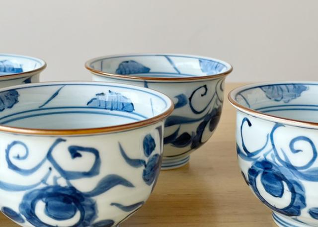 白磁に伝統的な文様が染付で描かれた、飽きの来ない波佐見焼の煎茶碗。 飲み口に茶色の線が巻かれており、引き締まった印象を与えます。 来客のご準備に是非いかがでしょうか。