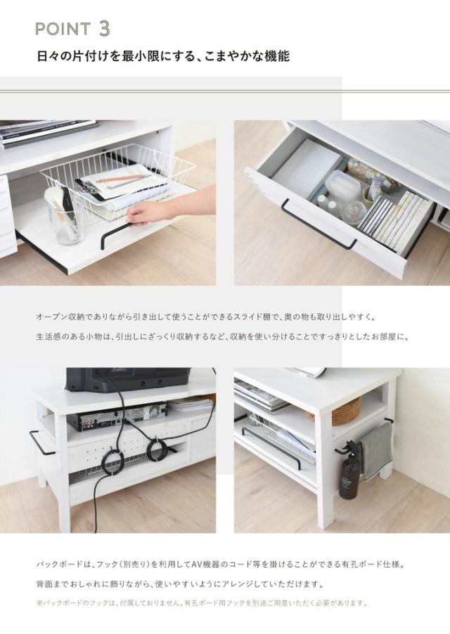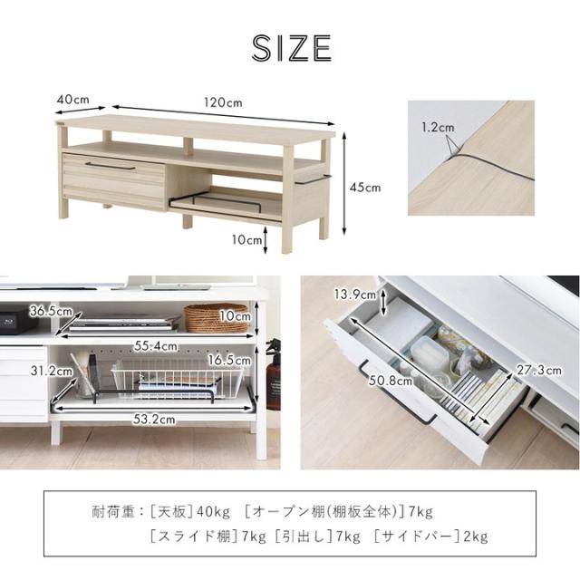 | 耐荷重 | 天板:約40kg オープン棚(棚板全体):約7kg スライド棚:約7kg 引出し:約7kg サイドバー:約2kg |