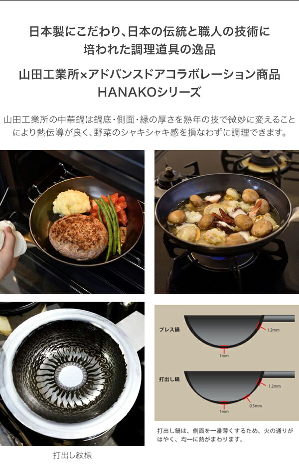 横浜中華街の老舗超有名中華料理店を含む約8割の店で使われている、TVで取材多数の「山田工業所」の打出し中華鍋。 中華鍋は鉄板を一気にプレスして成形する「プレス式」が大半の中、山田工業所では熟練の職人が未だに手作業でハンマーの位置を調整しながら成形するその数なんと5,000回! 「日本では唯一ここだけ」の「打出式」で製造しています。