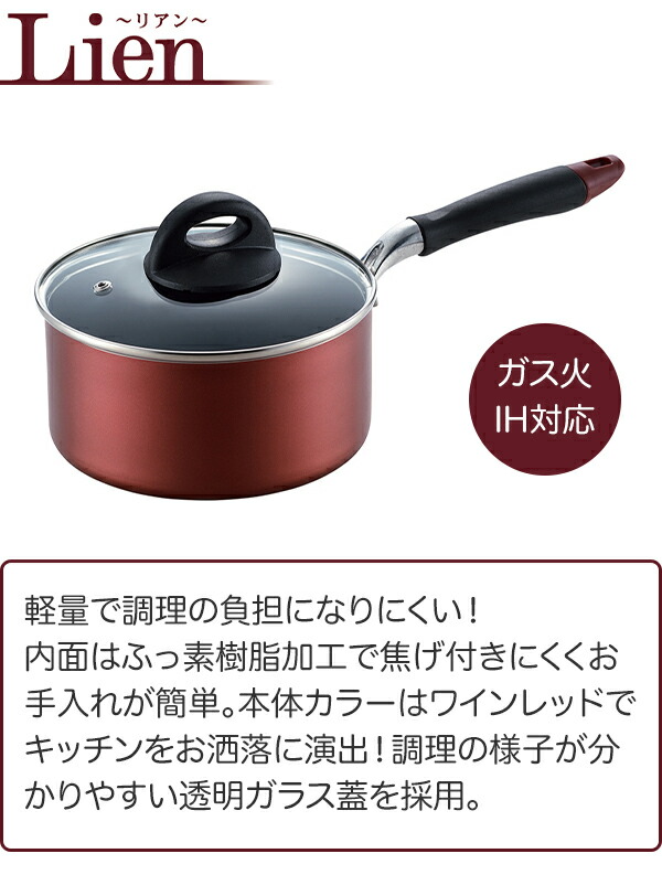 軽量で調理の負担になりにくい!内面はふっ素樹脂加工で焦げ付きにくくお手入れが簡単。本体カラーはワインレッドでキッチンをお洒落に演出!調理の様子が分かりやすい透明ガラス蓋を採用。ガス火・IH電磁調理器100V・200V対応。 |