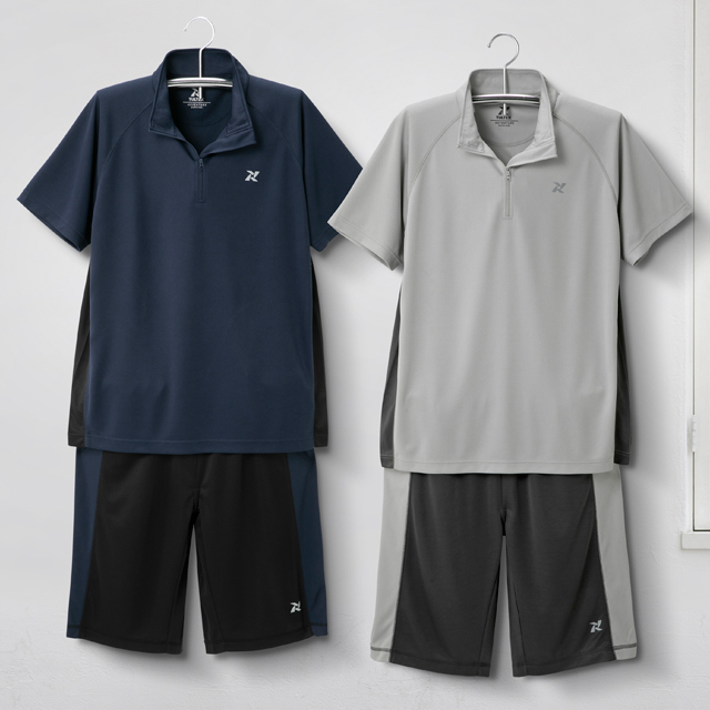 ご自宅でのリラックスタイムに…軽い運動にも・・・ハーフジップの半袖プルオーバーとショートパンツの上下セットお得な2色組!
