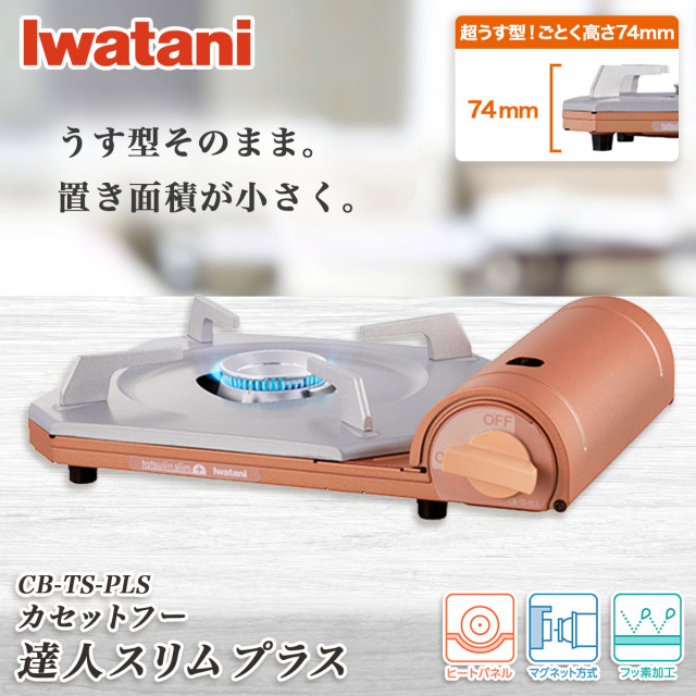 商品名 イワタニ カセットフー 達人スリムプラス CB-TS-PLS メーカー イワタニ カラー メタリックコーラル メーカー保証期間 1年 商品サイズ (幅)333×(奥行)257×(高)84mm 商品重量 約 1.2kg(容器(ボンベ)は含まず) 最大発熱量(ガス消費量) 3.3kW (2,800 kcal/h 相当、236g/h) 連続燃焼時間 約 70 分