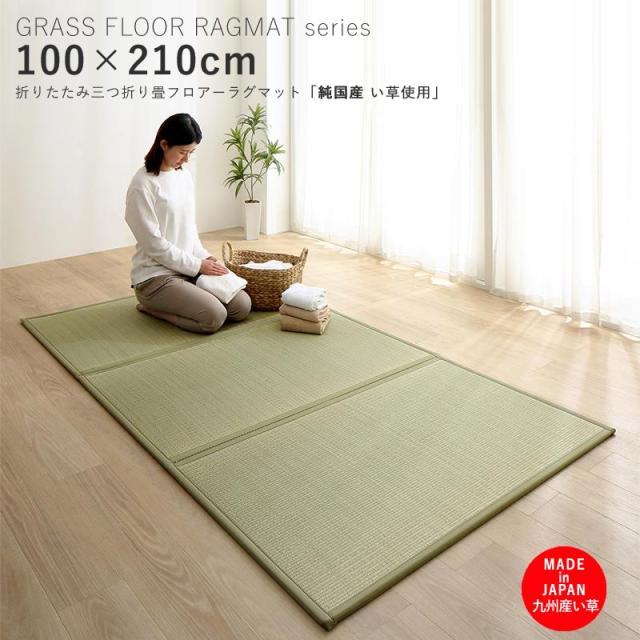 GFR 三つ折り畳マット 100 × 210cm シングルサイズ グリーン色 安心の 国産 日本製 敷布団マット 九州産い草 防菌 防臭 消臭 吸湿 調湿 国産畳ならではの多機能たたみラグ 夏用 グラスラグマット