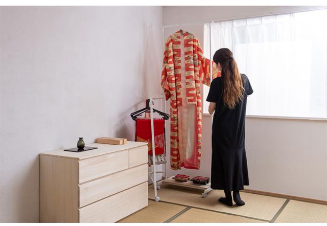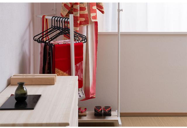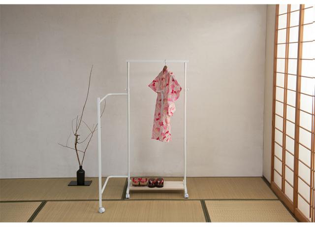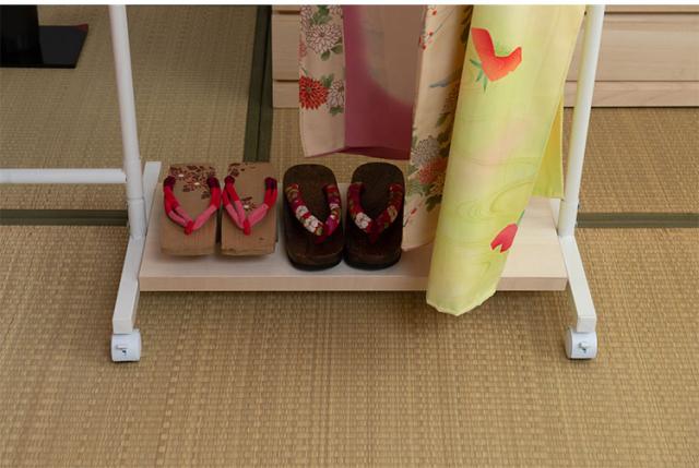 ■商品について/着物のハンガーと呼ばれる衣桁【IKOU】シリーズ。お洒落なキャスター付きの衣桁として新登場!!カラーは2色から選べます。洋室でも合う、シンプルで明るいホワイトフレーム×白木桐板、和の雰囲気はもちろん洋室でも合うブラックフレーム×ブラウン桐板の2カラー。桐生地仕上げの棚板とホワイトのフレームで明るい色系の着物などが映え、ブラックカラーはアジアンテイストにも合うデザインで様々なお部屋に合います。伸縮機能のハンガーは高さを低くして子供の成長から使え便利。通常の衣桁は使う時は広げて使い、閉じている時には使えませんが、この衣桁は閉じている時も使えて、しかもキャスターで移動が簡単です。使う時にサッと出して広げる、閉じて隙間にサッと直す。使いやすくて大変便利な衣桁です。