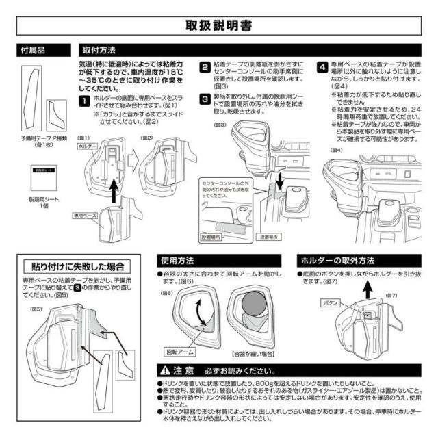 ・ドリンク容器の形状・材質によっては、出し入れしづらい場合があります。その場合、停車時にホルダー本体を押さえながら出し入れしてください。