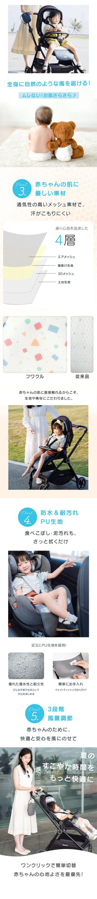 赤ちゃんも笑顔で快適!『赤ちゃんに優しい吸風モード』とも搭載の革新的扇風機。通気性抜群 3Dメッシュ4層構造で、一年中快適!3段階調整可能、防水・耐汚れで丸洗いOK!出産祝いに最適