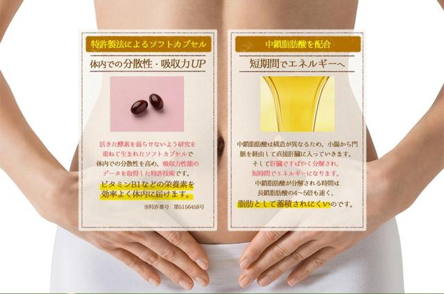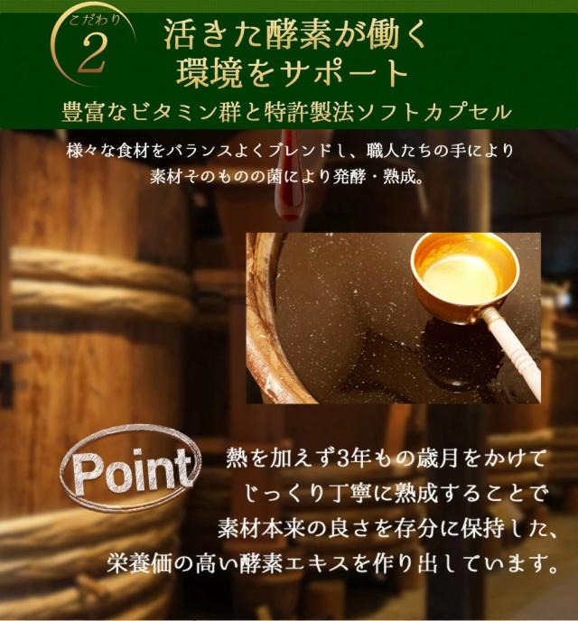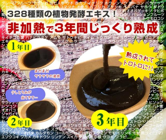 | 原材料名 | 植物発酵エキス(オレンジ・カシューナッツ・キウイフルーツ・ごま・大豆・バナナ・りんご・アーモンドを含む)(国内製造)、食用オリーブ油、食用ぶどう油、中鎖脂肪酸油、食用こめ油、黒砂糖、食用精製加工油脂、カルシウム(天然水由来)、穀物発酵エキス(小麦を含む)、有胞子性乳酸菌/ゼラチン、グリセリン、グリセリン脂肪酸エステル、着色料(カラメル)、ビタミンB1、ビタミンB6、ビタミンB2、ビタミンB12(原材料の一部にオレンジ・カシューナッツ・キウイフルーツ・ごま・大豆・バナナ・りんご・アーモンド・小麦・ゼラチンを含む。) |