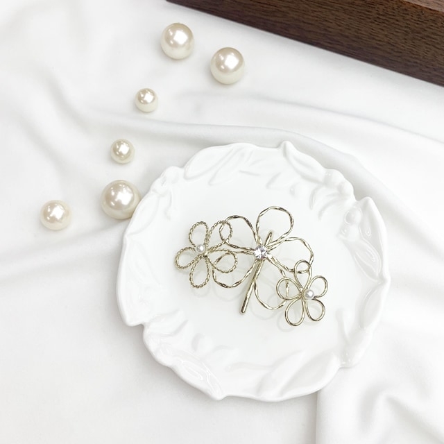 異なる大きさのフラワーモチーフが連なったポニーフック。結び目に差し込むだけのお手軽ヘアアクセです。さりげなく輝く真ん中のビジューとパールがより女性らしさを演出してくれます。