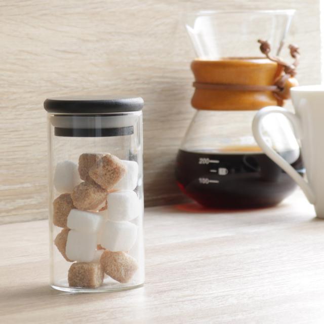 ナッツや料理に使うローリエ、角砂糖などを入れるのに最適なコンパクトサイズのボトルキャニスターです。本体は透明なガラス製なので、中身が一目でわかり残量の確認もしやすく、詰め替えのタイミングがわかりやすいです。