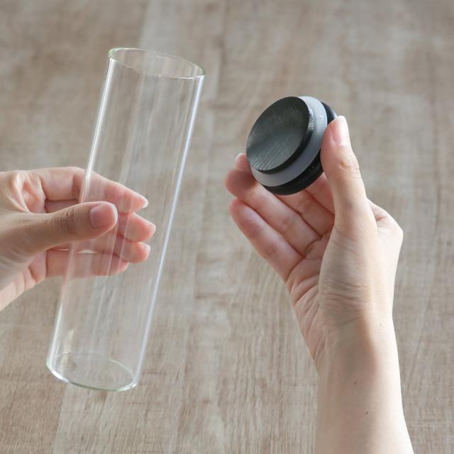 ナッツやドライフルーツ、ちょっとしたお菓子などを入れるのに最適なコンパクトサイズのボトルキャニスターです。本体は透明なガラス製なので、中身が一目でわかり残量の確認もしやすく、詰め替えのタイミングがわかりやすいです。