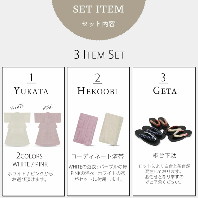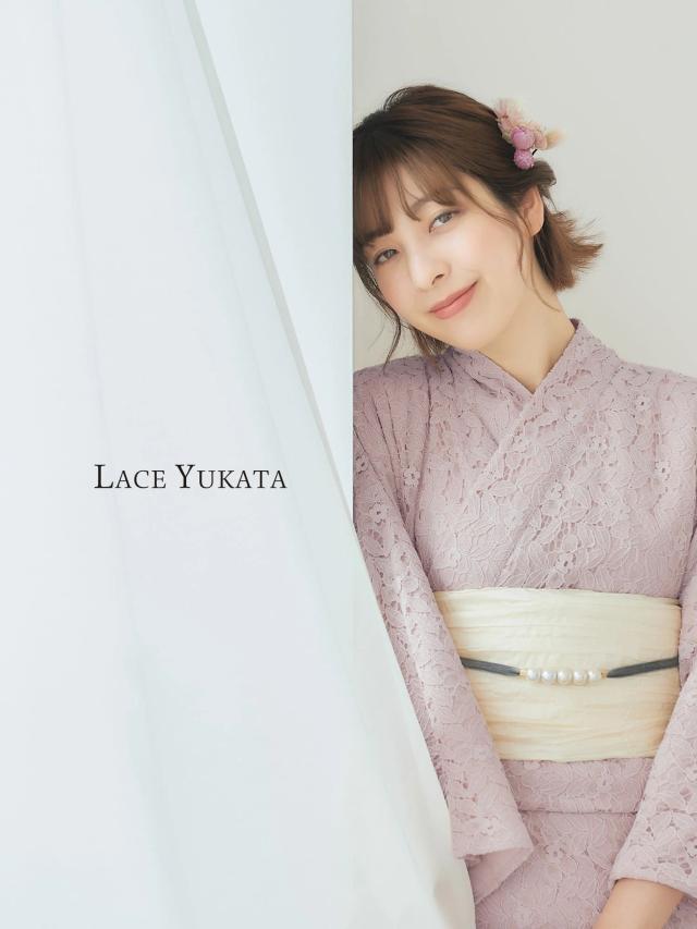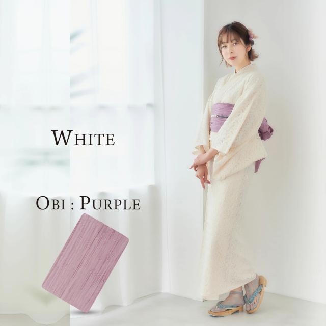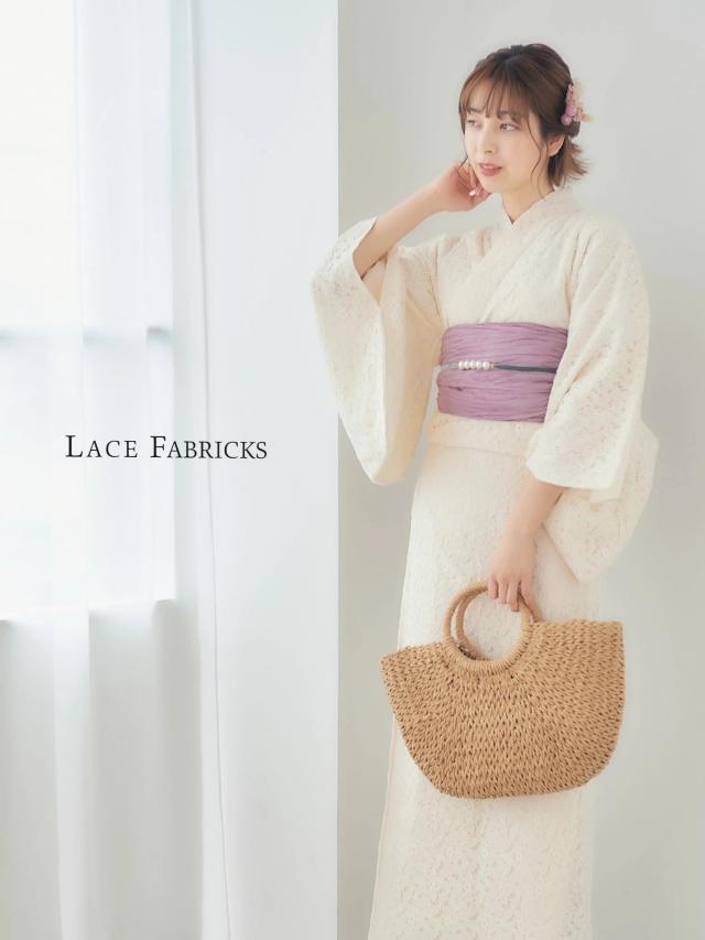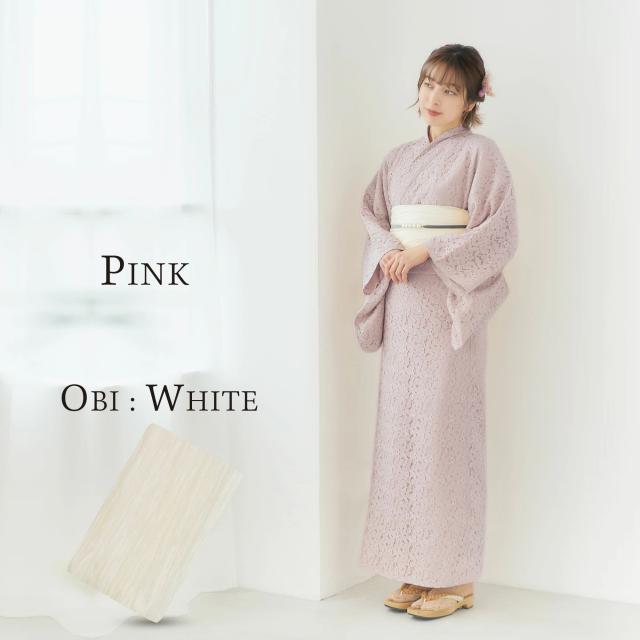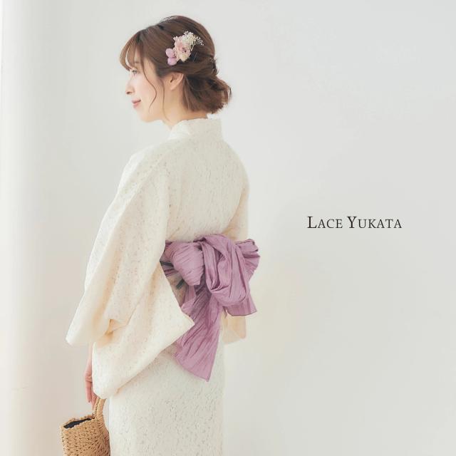 レース 浴衣 3点セット (ゆかた/ しわふわ 兵児帯 / 下駄) くすみピンク 白 オフホワイト クリーム 上品 きれいめ 大人の浴衣 セット 20代 30代 10代 華やか 夏着物 フェミニン コーディネート済兵児帯 パープル
