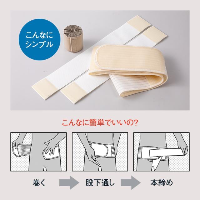 放置をしても治らないばかりか、腸閉塞や腹膜炎に至りかねない脱腸。膨らんだところを押し戻して矯正治療するのに、何より手軽に使える器具が切望されてきました。そこで脚の付け根からサッと通す、簡単装着を実現!サポート力を自由に調整でき、トイレでラクラク脱着できる気軽さで、腸を正しい位置へと癖づけしましょう。