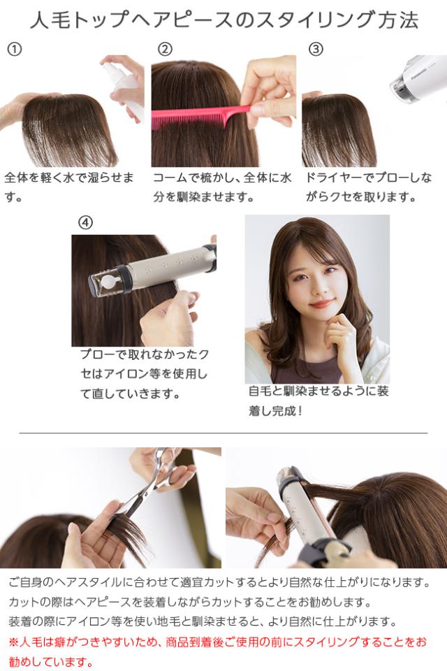 初めてブラッシングをされる場合、毛が抜け落ちますが、品質には問題ございません。ご使用方法や温度調整などによっては、ウィッグの毛髪部分や人工頭皮部分を痛める恐れがございますのでご注意ください。洗髪する際は手洗いをし、洗髪後は水気をタオルでふき取って、自然乾燥させるかドライヤーで乾かしてください。※こちらの商品は人毛を使用しているため、白髪が混ざっているものもございます。不良ではございませんのでご了承お願い致します。写真と実物の色が液晶の具合によって若干異なることがあることをご了承ください。製品の品質向上のため、製品の仕様は、予告なしに若干の変更がされる場合があります。