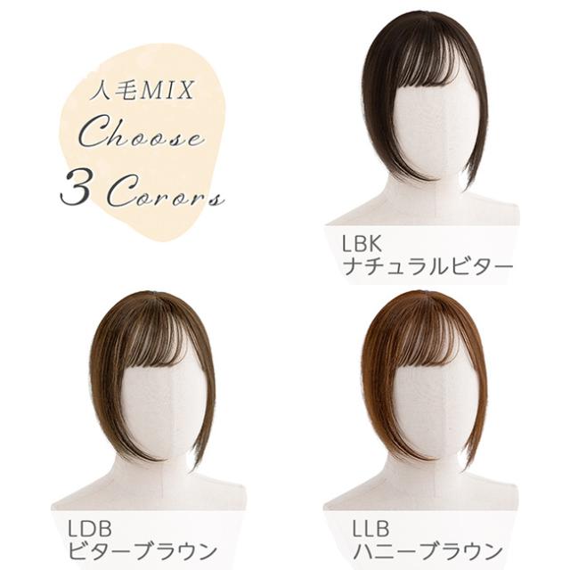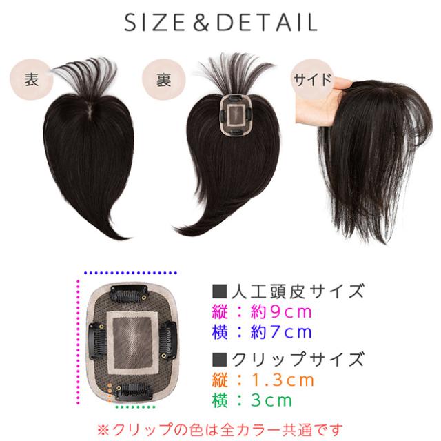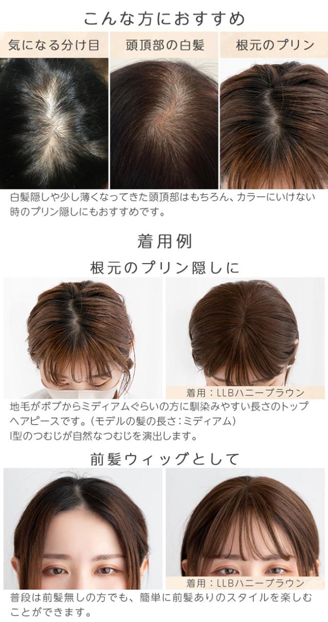 人毛MIX&前髪付きのトップヘアピースです。毛量は抑えめの作りなので広範囲のカバーよりは分け目周辺のカバーに向いています。白髪や少し薄くなってきた頭頂部はもちろん、カラーにいけない時のプリン隠しにもおすすめ。前髪付きタイプなので普段前髪無しでも簡単に前髪ありのスタイルを楽しむことができます。ボブからミディアムぐらいの長さの方にむいていますが、ロングの方もレイヤーカットが入ったような仕上がりになるのでお洒落に使っていただけます。ベーシックなカラーの3色展開です。