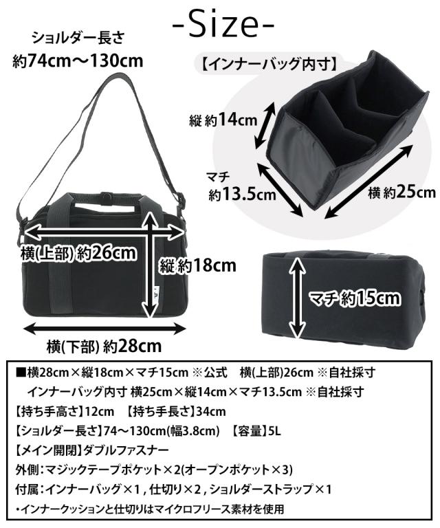 | サイズ(約) ※当店実寸値 | 公式サイズ 横28cm×縦18cm×マチ15cm 自社採寸サイズ 横(上部)26cm インナーバッグ内寸 横25cm×縦14cm×マチ13.5cm ※自社採寸 【持ち手高さ】12cm 【持ち手長さ】34cm 【ショルダーベルト長さ】74cm〜130cm(幅3.8cm、取り外し可) 【容量】5L | ||