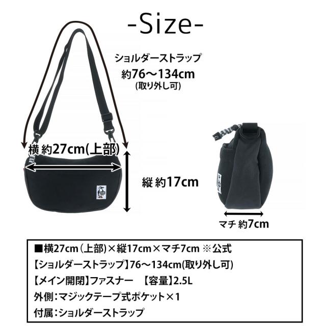 | サイズ(約) ※当店実寸値 | 公式サイズ 横(上部)27cm×縦17cm×マチ7cm 【ショルダーベルト長さ】76cm〜134cm(幅2.5cm、取外し可) 【容量】2.5L | ||