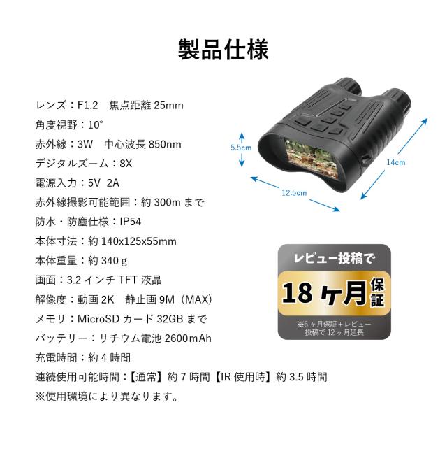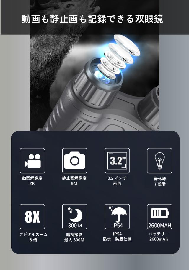 【公式ショップ】 M-WORKS ナイトビジョン 双眼鏡 録画 2K 8倍デジタルズーム 昼夜兼用 暗視スコープ ナイトスコープ 録画機能 赤外線 IP54 防水 防塵 夜間撮影 動物観察 レビューキャンペーン