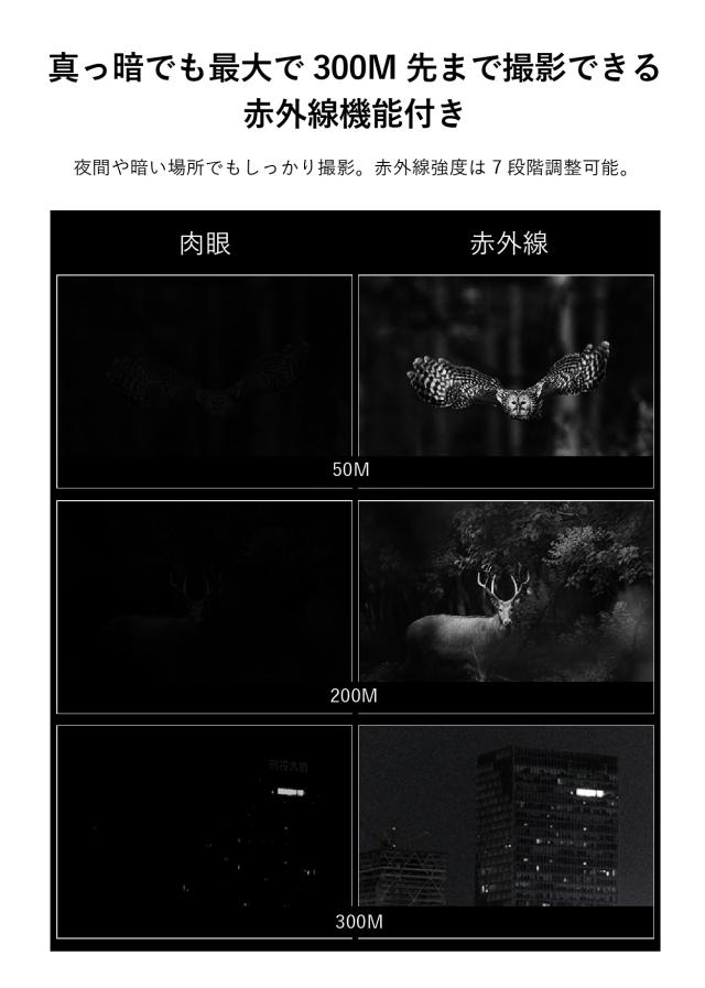 ★真っ暗でも最大で300M先まで撮影できる赤外線機能付き。夜間や暗い場所でもしっかり撮影。赤外線強度は7段階調整可能。
