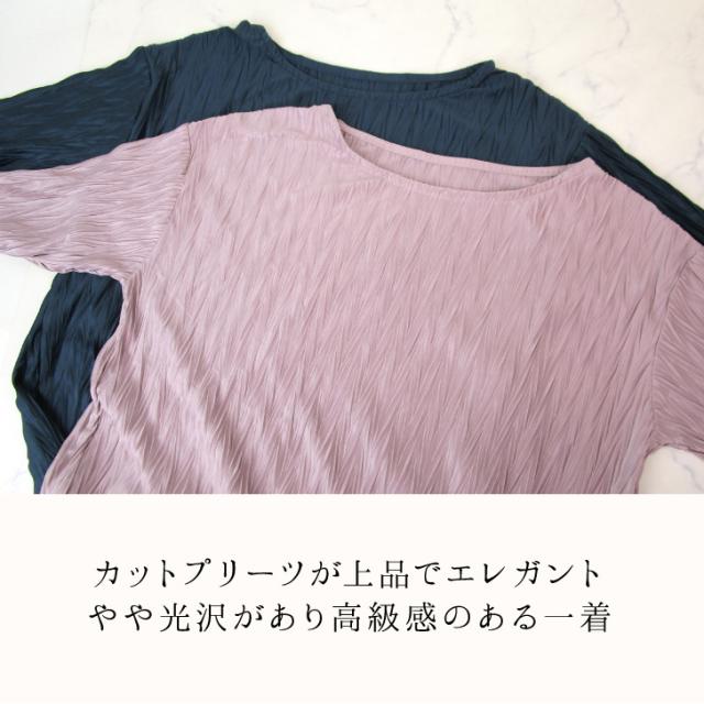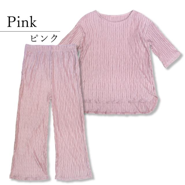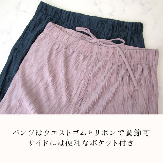 カットプリーツが上品でエレガントなセットアップ。生地にはやや光沢があり高級感のある一着。5分袖なので二の腕をカバーしたい方におすすめ。パンツはウエストゴムとリボンで調節可能。サイドには便利なポケット付き。大人っぽい落ち着いたカラーリングでおうち時間を快適に過ごすルームウェア。