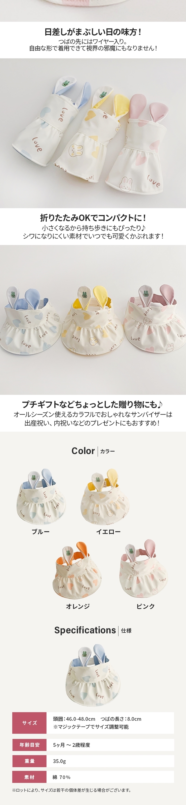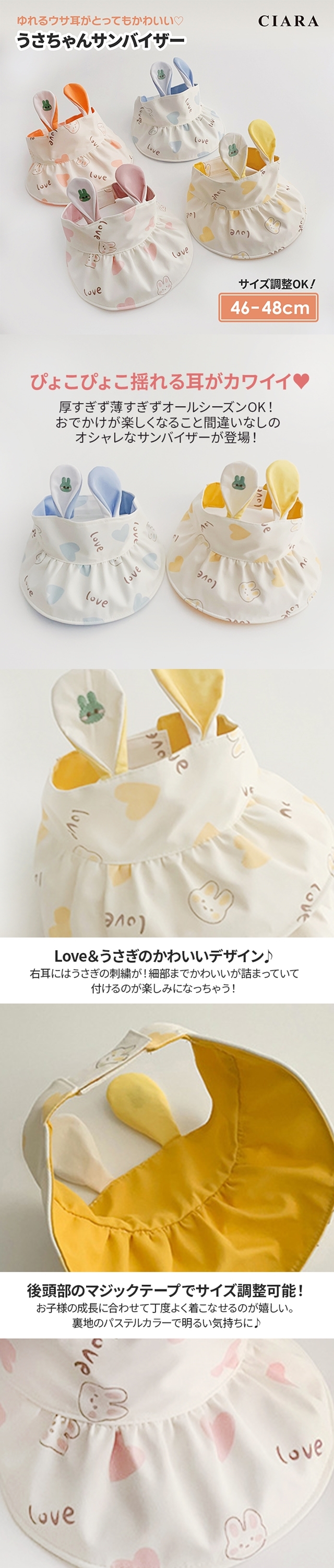 ベビー 帽子 サンバイザー 男の子 女の子 男女兼用 マジックテープ うさぎ 兎 ウサギ アニマル 動物 アニマルコーデ 折りたたみ 折り畳み 裏地 おしゃれ かわいい 可愛い シンプル つば カジュアル 46cm 48cm 0歳 1歳 2歳 子供服 ベビー服 ベビーファッション 日よけ 日除け 熱中症対策 熱中症 日焼け 日焼け対策 お揃い お揃い 兄弟 姉妹 綿 幼稚園 保育園 通園 新生児 子ども こども 子供 キッズ 赤ちゃん 年賀状 撮影 100日祝い 百日祝い こどもの日 お宮参り バレンタインデー ホワイトデー クリスマス お返し 新生活 お出かけ お散歩 公園 アウトドア 普段使い コンパクト 持ち歩き 春 夏 秋 冬 オールシーズン キッズ用帽子 セール お得 ポイント消化 福袋 プレゼント プチギフト プレゼント交換 ギフト CIARAポーチ雑貨屋 シアラ OEM 大量注文 ネスリーフ 2026 遅れてごめんね