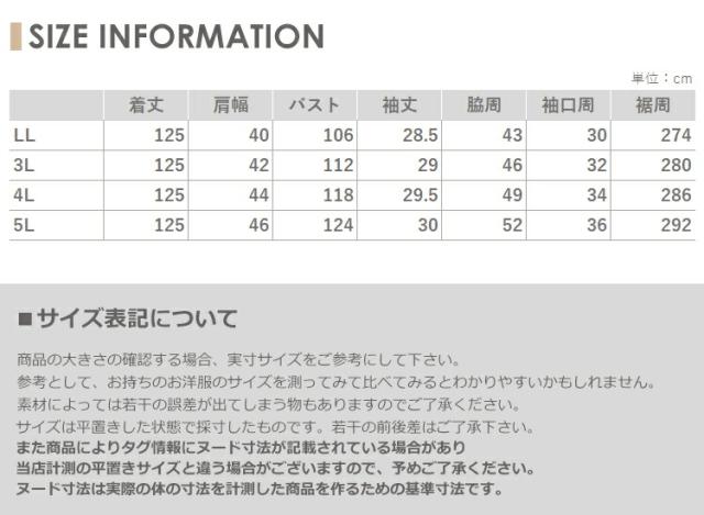 4L:着丈125 肩幅44 バスト118 袖丈29.5 脇周49 袖口周34 裾周286