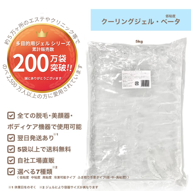 業界最安値【クーリングジェル ベータ(低粘度)5kg/袋 】(初回限定価格,4袋迄購入可,2袋から送料無料)工場直販 業務用 脱毛用ジェル(空冷式 水冷式 連射式 SHR IPL OPL LED その他全て) 超音波 エコー キャビ ハイフ フォト RF E-Lite EMS 痩身等全ての脱毛機&美顔器使用OK