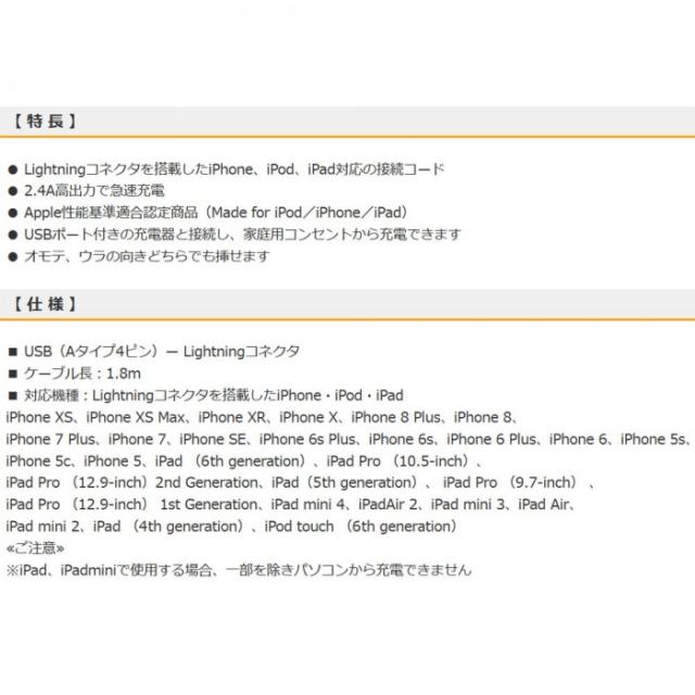 | Lightningコネクタを搭載したiPhone、iPod、iPad対応の接続コードです。USBポート付きの充電器と接続し、家庭用コンセントから充電できます。オモテ、ウラの向きどちらでも挿せます。 |