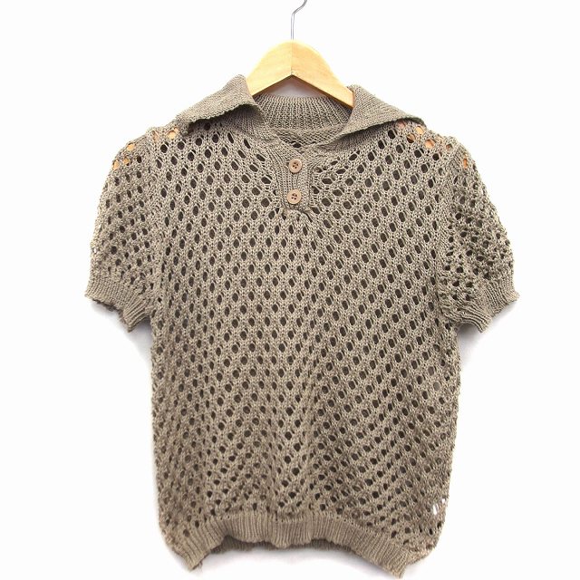 【中古】アムールボックス AMOUR BOX ニット カットソー ショート丈 かぎ針編み 襟 ハーフボタン 半袖 グレージュ