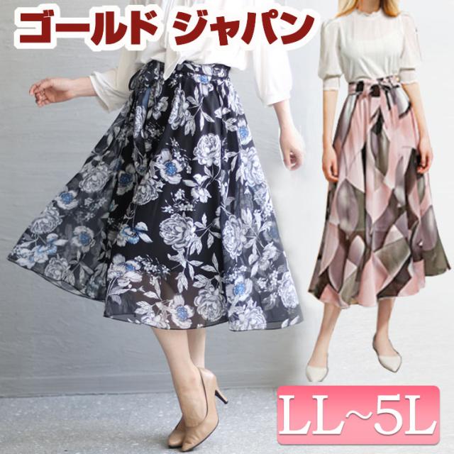 春新作 大きいサイズ レディース ボトムス スカート 花柄シフォンロングスカート ミディアムスカート ミモレスカート 花柄スカート ミディアム 膝丈 ミモレ 花柄 フレア シフォン リボン ウエストゴム 韓国 春服 夏服 LL 2L 3L 4L 5L ブラック 黒 ピンク ゴールドジャパン