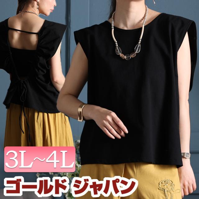 春新作 大きいサイズ レディース トップス カットソー バックオープントップス 半袖 半そで ノースリーブ バックオープン バックシャン ギャザー リボン 背中開き フレンチスリーブ 無地 クルーネック ストレッチ 伸縮 伸びる 春服 夏服 3L 4L ブラック 黒 ゴールドジャパン
