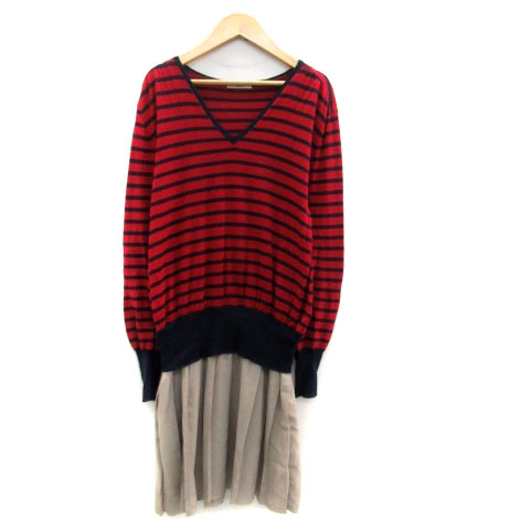 【中古】フレイアイディー ドッキングワンピース ニット Vネック 長袖 ボーダー柄 ウール F 赤 ベージュ レディース