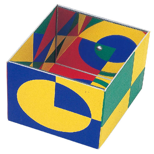 箱の3面に描かれた図形が奧に貼られた鏡の反射により無限に連続しているように見えます。