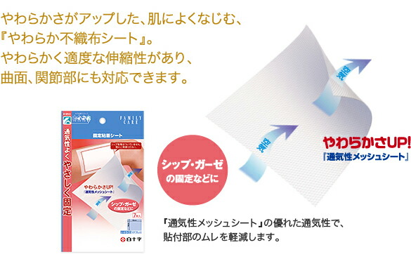 ● メッシュタイプの不織布に、アレルギーの心配が少ない非天然ゴム系の粘着剤を使用しています。